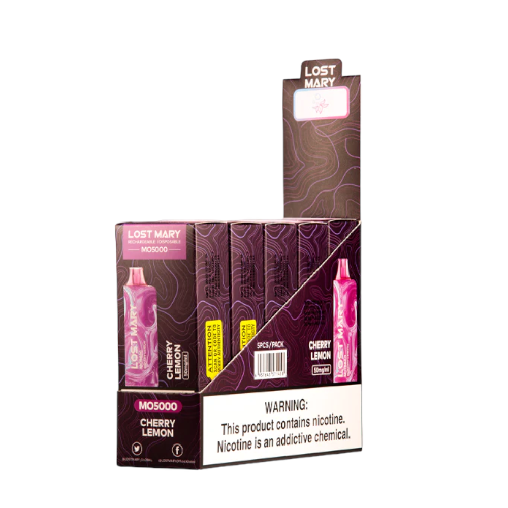 The Cherry Lemon Lost Mary MO5000 rechargeable vape adds a kick of sour lemon to a sweet cherry for a well-balanced vape experience.