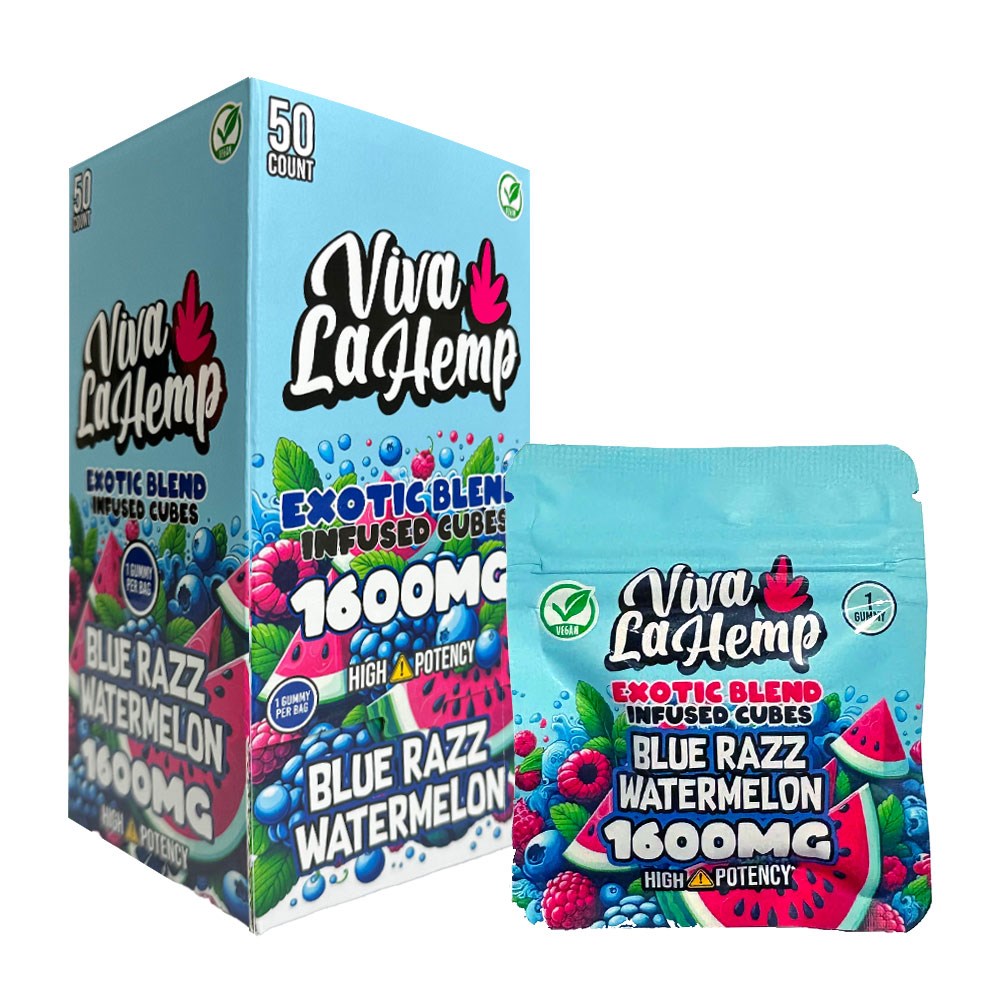 Dive into the vibrant blend of Blue Razz and Watermelon with Viva La Hemp Exotic Blend Cubes 1600MG. Each bite combines the sweet freshness of watermelon with the tangy zing of Blue Razz, delivering a flavorful burst while Delta 8, HHC, THC-P and Delta 9. work together for balanced effects. Ideal for unwinding with a touch of brightness.
